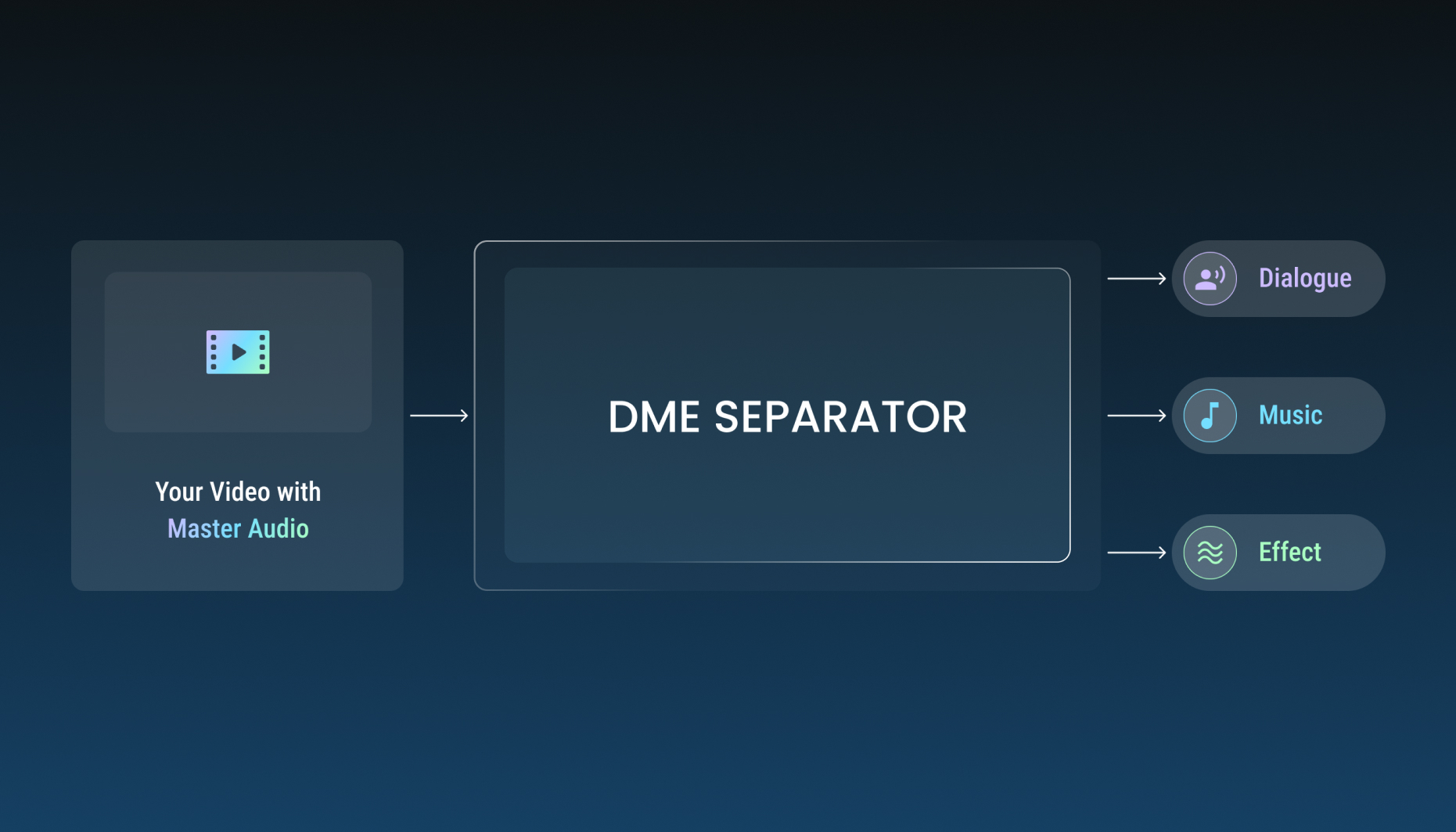 DME Separation is the technology used to cleanly extract these three elements into individual tracks from a single, flattened "Full Mix" or Master audio file. In the industry, this is often referred to as 'M&E Separation' (separating Dialogue from Music/Effects), and it falls under the broader categories of 'Source Separation' or 'Stem Separation.'