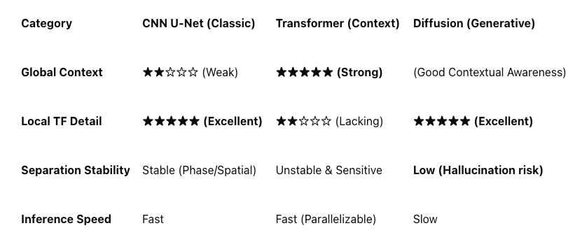 Many companies chase high SDR (Source-to-Distortion Ratio) scores, but at Gaudio Lab, we know that "High SDR does not always equal high-quality sound." Just as a speaker’s spec sheet can’t describe the "warmth" of its sound, DME separation has nuances that numbers cannot capture. We prioritize 'Perceptual Perfection'—preserving the original texture and phase integrity that professionals demand, even if it means ignoring "empty" SDR points. (We will dive deeper into "SDR: The Trap of Numbers" in our next post.)