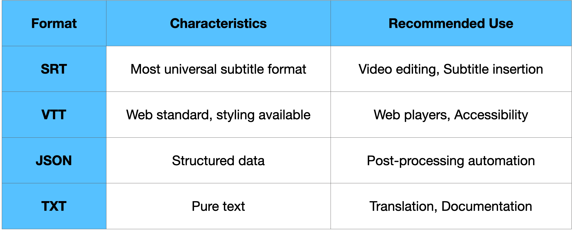One-line conclusion: You can choose SRT, VTT, JSON, TXT, etc., depending on your usage.