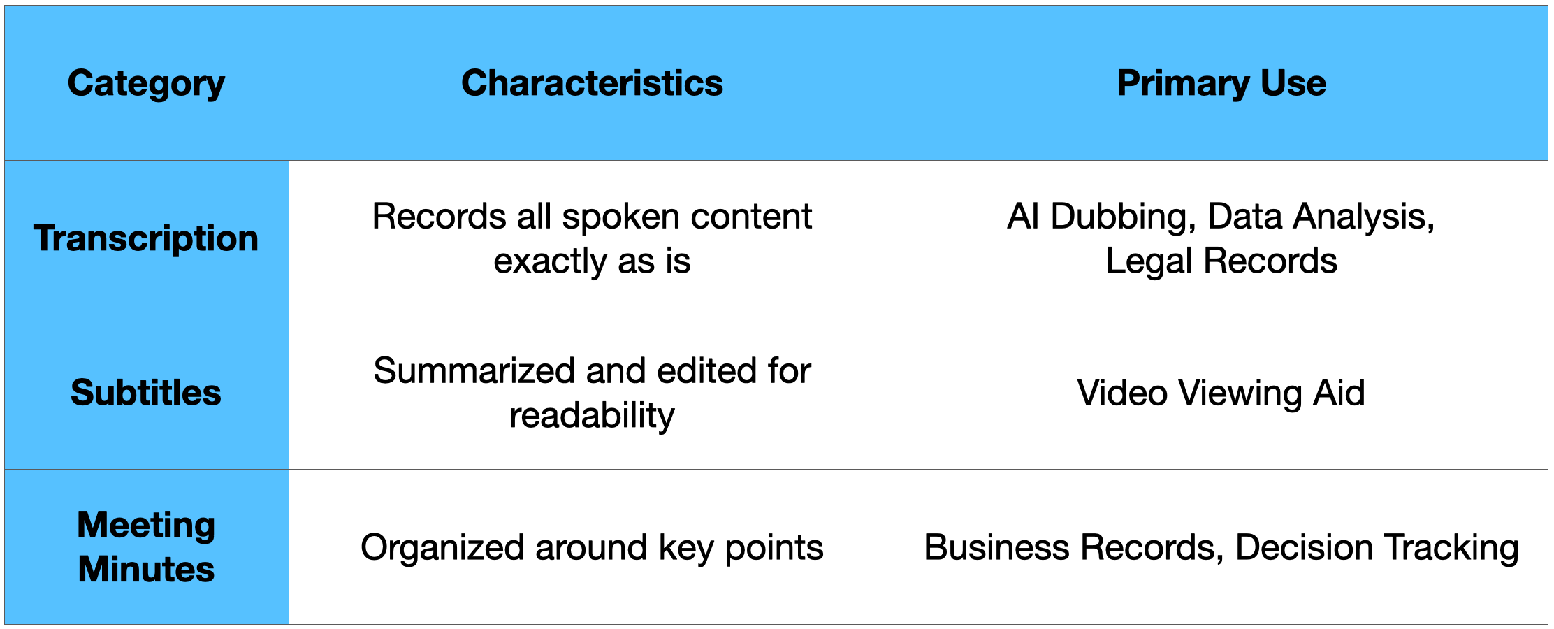 Simply put, transcription is the process of converting all spoken content into text. The table below summarizes the differences between Transcription, Subtitles, and Meeting Minutes.
