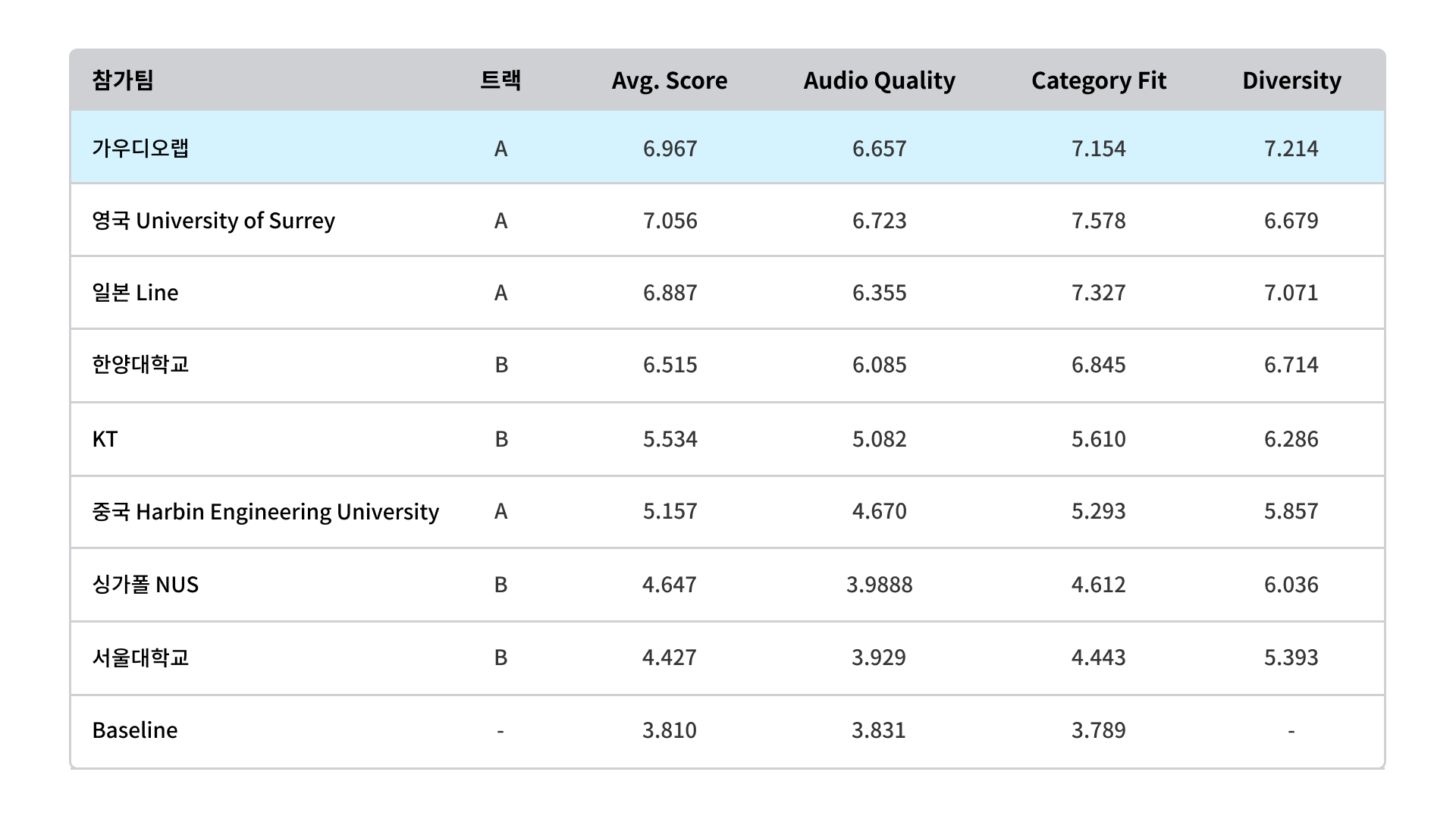 이렇게 되면 모델이 소리를 생성할 때, 깨끗한 소리를 생성할지, noisy 한 소리를 생성할지 정할 수 있게 되고, 실제로 저희가 DCASE Challenge에 참여했을 때, 다양한 소리를 생성하면서 음질도 좋다는 평을 받기도 했습니다. 당시 객관 평가 지표 (FAD)로 top contender를 각 트랙 별로 4팀씩 선발한 뒤 청취 평가를 진행했는데요. 보시다시피 가우디오랩은 깨끗한 음질과 수없이 다양한 소리를 생성해낼 수 있는 다양성 분야에서 높은 점수를 기록했습니다. 모든 소리를 생성할 수 있는 모델인 FALL-E로 일부 카테고리에 한정해 심사하는 대회에 나가 몸풀기 한 것치고 꽤 좋은 성과를 냈다고 할 수 있어요.