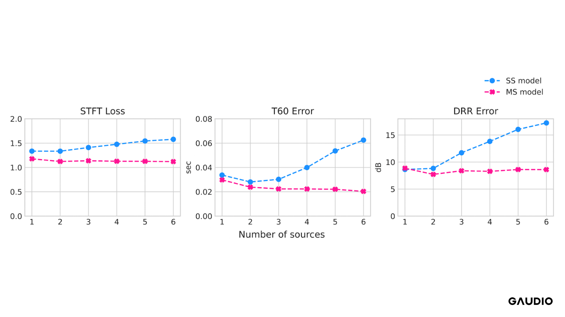 기존에 단일 음원으로만 학습한 모델 (SS model - 파란색)과 저희가 정의한 다중 음원을 이용한 학습 방법대로 (MS model - 분홍색)을 비교해보았습니다. 음원의 갯수를 1개에서부터 6개까지 늘리면서 RIR을 예측한 결과를 위 figure 4에서 보실 수 있습니다. 단일 음원 모델은 갯수가 증가하면 성능이 악화되는 것을 볼 수 있습니다. 하지만 다중 음원 모델은 갯수가 증가하더라도 일정하고 안정적인 성능으로 RIR을 예측하는 것을 확인할 수 있었습니다!