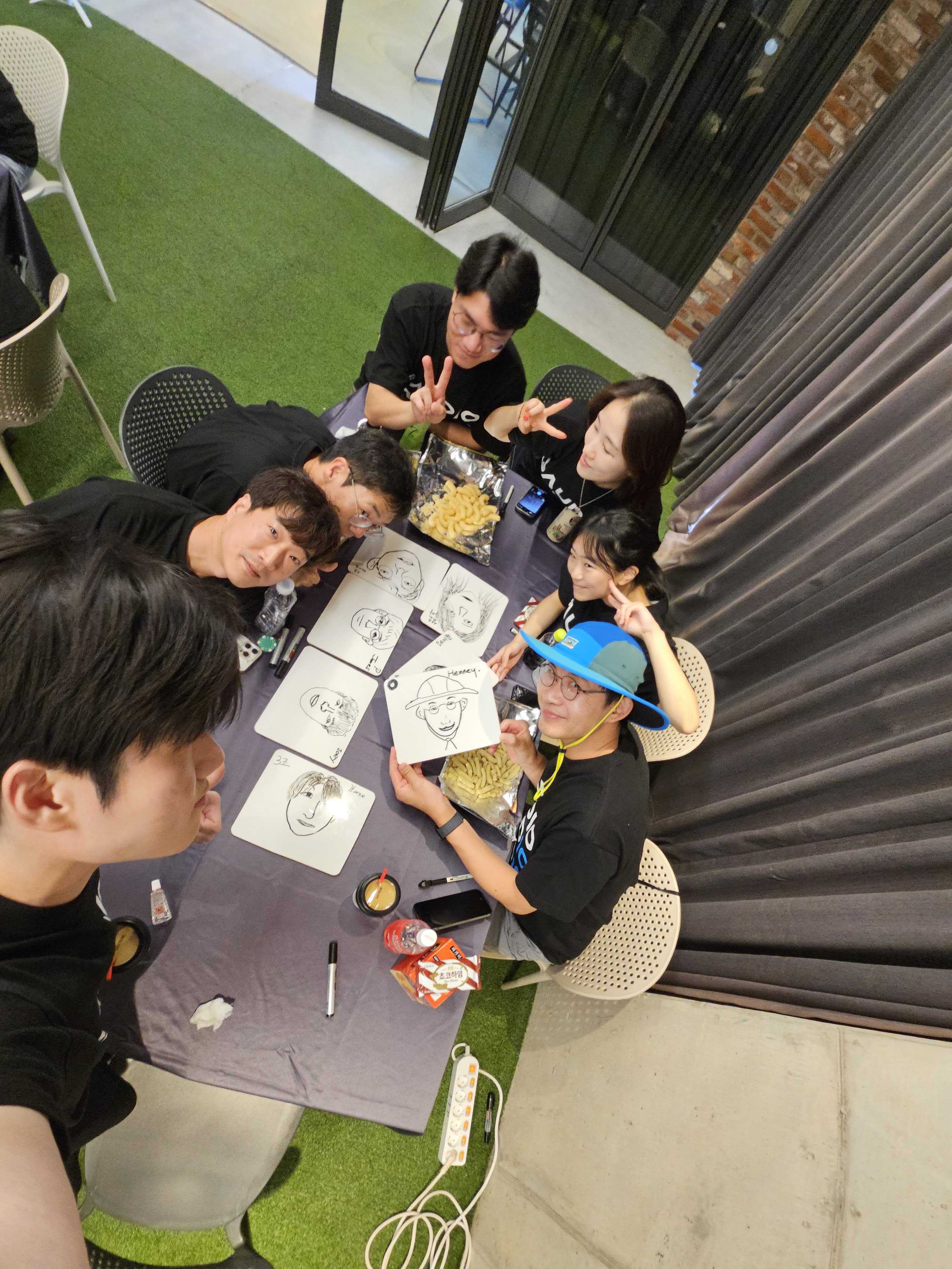 TV에서만 보던 게임들을 직접 해보며 모두가 목청 터져라 응원하고, 웃느라 바닥에 주저앉을 만큼 열기 가득한 시간이었죠. 연예인 맞추기, 과자 이름 맞추기, 캐릭터 이름 맞추기 등등 정말 많은 게임을 했어요. 그치만 그 중에서도 하이라이트는 조원들이 직접 그려준 초상화! 우리… 상처받지 않기로 약속해요? 🎨